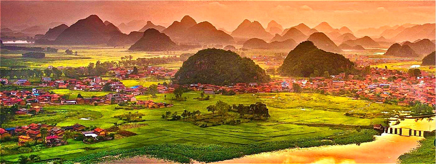 It is located in a hidden valley, 450 km away from Kunming, and can only be reached by boats. After about 20 minutes’ boating, an agricultural fairyland emerges, with clear streams, green fields, bamboos and banyan trees, as well as Zhuang people working around the farm with wooden rake and wooden water wheel. With no roads and electricity, it is pristine and undisturbed by modernity.