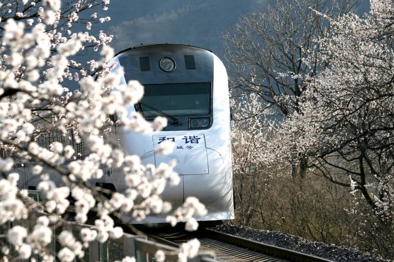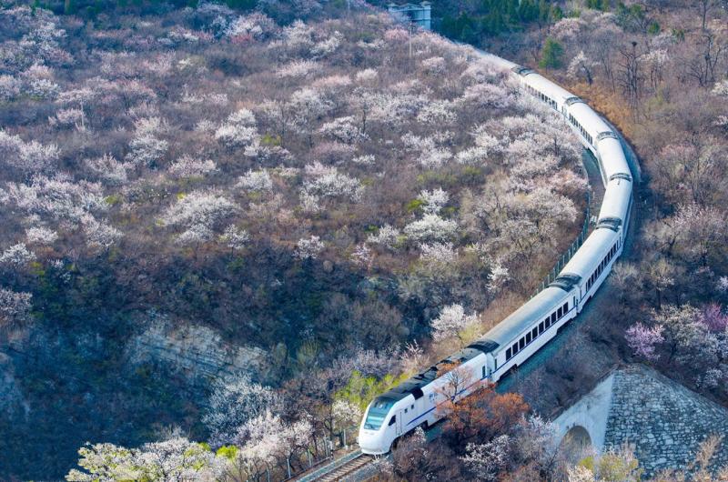 In spring, the train twists its way through the cherry blossom and apricot blossom of Juyongguan Great Wall. Immerse yourself in the fresh air and warm sunlight of spring.
