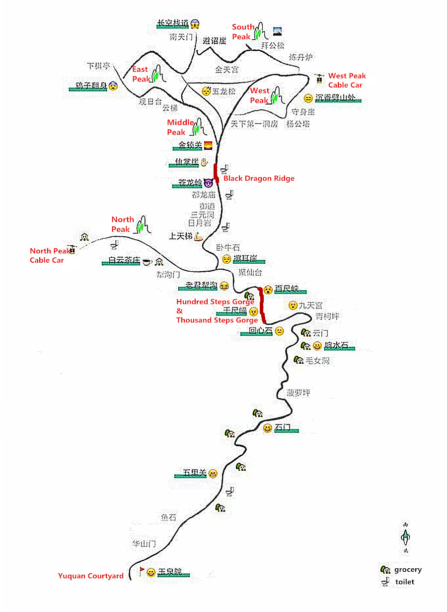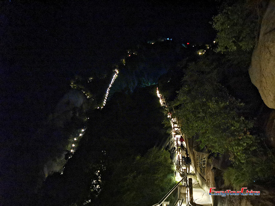 There is only one way to climb Mount Hua at night. It’s from Yuquan Courtyard to North Peak to Middle Peak to East Peak. Check out the time of sunrise or sunset in tourist center before you set off.