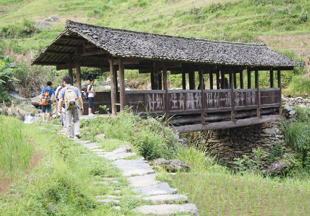 After nearly an hour's hiking, we met a small wind and rain bridge on the way. Very lovely, right?