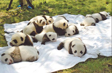 Of the 12 cubs, eight are twins. On September 26, these newborn panda babies made their debut. Because they are only one or two months old, they are weak and sleep most of the time. The climax of the panda trip came on the morning of Oct 4, when the sun broke through the clouds for the first time during the holiday. Keepers put the cubs in baskets and took them to an open field for a sunbath.