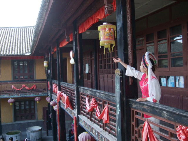I wore the dress of Bai ethic girls, standing in the second floor of the courtyard. The customs and culture there impressed me.