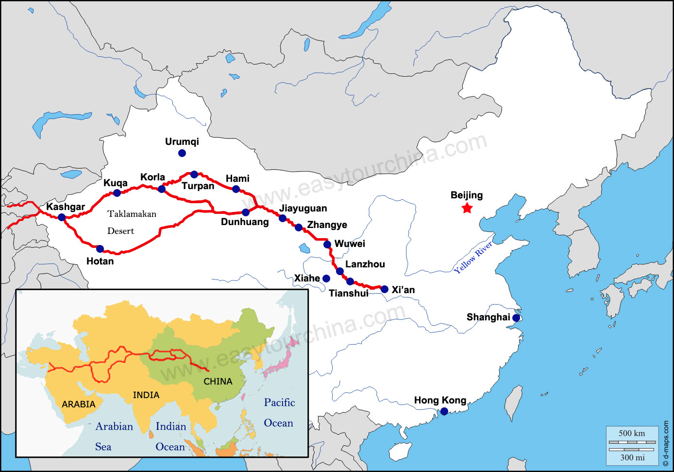 The North Route: Xian - Dunhuang - Hami - Urumqi - Yili - the former Soviet Union - the Caspian Sea and the Mediterranean Sea - Rome.