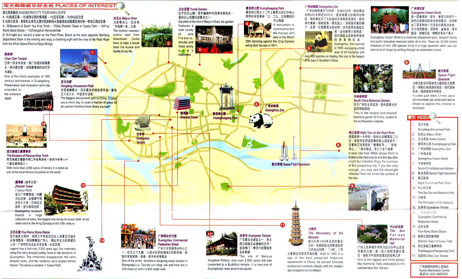 Map of Guangzhou Attractions points out locaitons of the most famed tourist spots in Guangzhou covering scenic spots an cultural legacy, including Chen Clan Temple, Guangzhou Zoo, Sun Yat-sen Memorial Hall, Guangxiao Temple, Zhenhai Tower, Guangzhou Ocean World, and more, suitable for both single and family tour. This tourist map is in both English and Chinese, so you can show the map to someone when asking for directions.